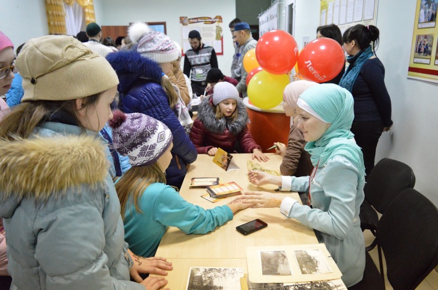 Авыл мәдәният йорты фойесында шәһәр яшьләре яулык бәйләү, хна белән рәсем ясау (мехенди), гарәп...