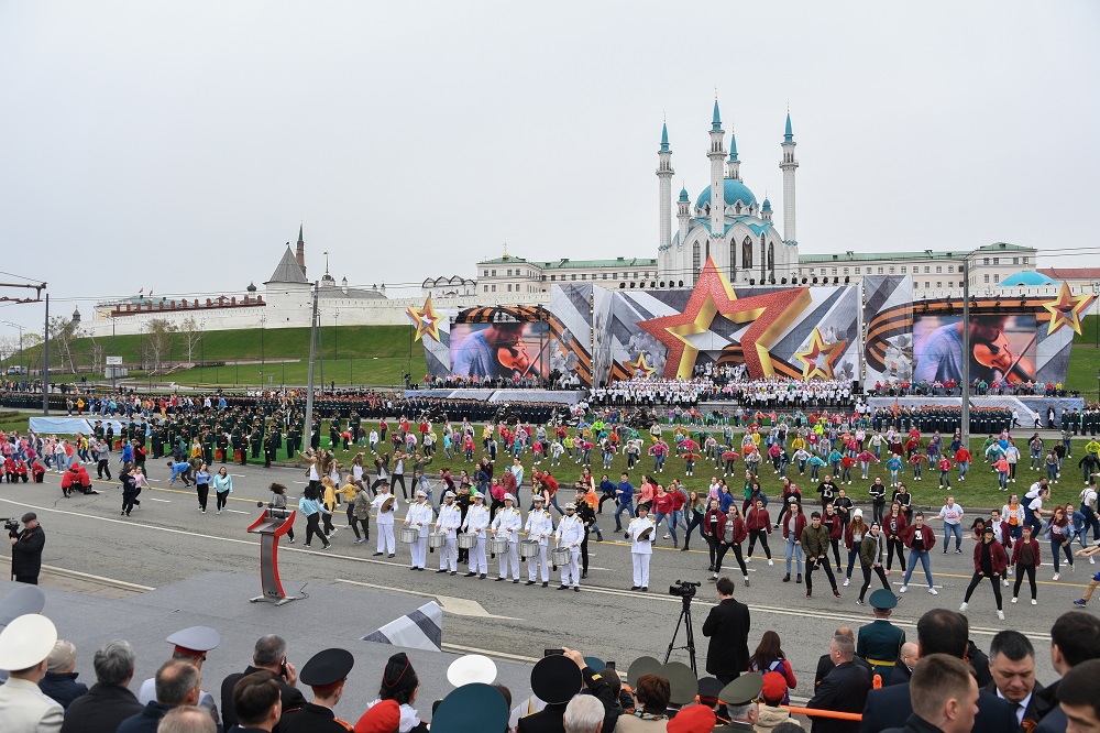 Казанда гаскәрләр һәм хәрби техниканың тантаналы йөрешендә бүген 2 меңнән артык гаскәриләр катнашты. Быелгы бер үзенчәлек шунда: гаскәрләрнең гадәттәгечә йөрешенә Юнармия әгъзалары, кадет класслары, хәрби училище курсантлары да кушылган иде. Гаскәрләрнең йөреше хәрби техника һәм ретро автомобильләр узуы белән тәмамланды.