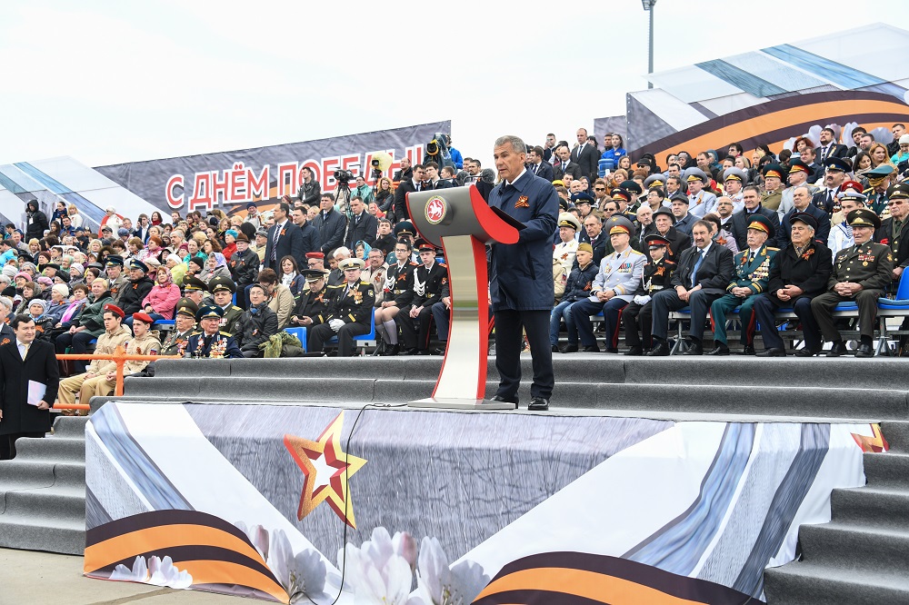 «Җиңү бәйрәме ул – күп милләтле халкыбыз батырлыгына дан. Дуслык, бердәмлек, туган илне сөю символы. Нәкъ безнең ил нацизм тамырына балта чапты. Европаны коллыктан азат итте. Миллионнар хисабына фашизмны җиңде. Безнең бабаларыбыз һәм аталарыбыз туган җирне саклап дошманга каршы үз-үзләрен аямыйча көрәште. Яу кырларыннан әйләнеп кайтмаган каһарманнарга һәм инде хәзер безнең арада булмаганнарга мәңгелек дан! Хөрмәтле сугыш һәм тыл хезмәтчәннәре бүгенге имин тормыш өчен без сезгә рәхмәтле. Сезнең батырлык, туган илгә булган чиксез мәхәббәтегез һәркем өчен үрнәк. Барыгызга да чын күңелдән озын гомер, исәнлек-саулык һәм имин көннәр телим», – диде Президент үзенең чыгышында.