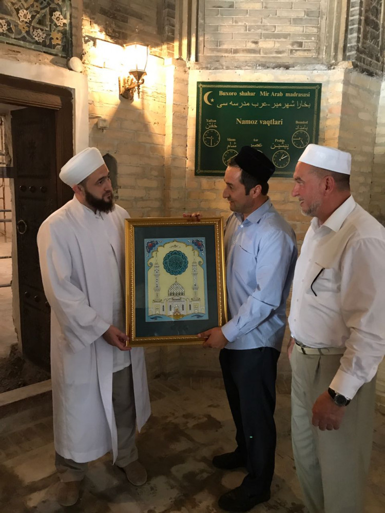 Бүген мөфти Камил Сәмигуллин бөтен дөньяга танылган Бохара мәдрәсесендә - "Мир-и Араб"та булды. Мәдрәсәгә XVII гасырда нигез салына. Биредә Россиянең күпчелек хәзрәтләре дини белем алган. Мөфти һәм башка Россия хәзрәтләрен мәдрәсәнең тарихы, бинасы, уку шартлары, бай мираслы китапханәсе белән таныштырдылар. Китапханәдә 1914 елда дөнья күргән Казан басмасы - Коръән китабы саклана. Мәдрәсә җитәкчелегенә Камил хәзрәт истәлеккә шамаил бүләк итте.
