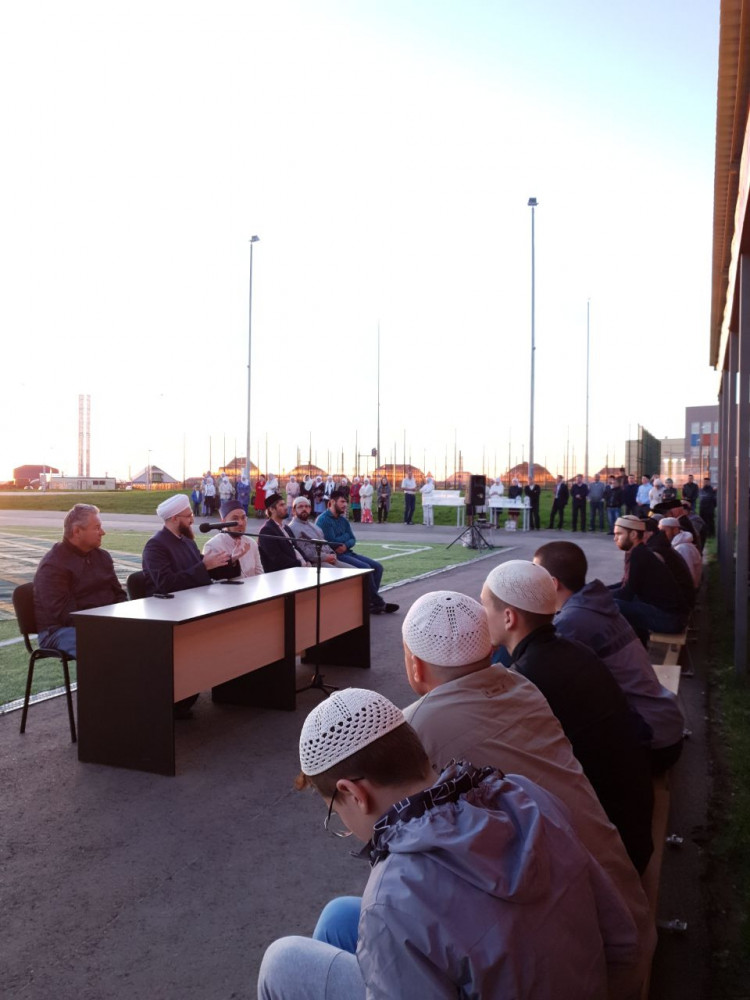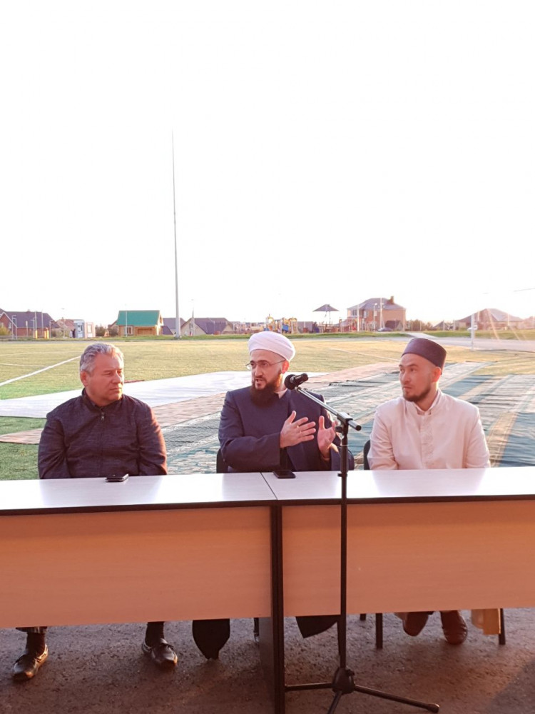 Татарстан мөфтие район халкы белән очрашу үткәрде, рамазан ае, зәкят, нисаб, фидия, фитыр сәдакасы, Ураза гаете һәм бәйрәм намазына кагылышлы сорауларга җавап бирде. Җыелган халык Камил хәзрәт Сәмигуллин җитәкчелегендә район үзәк стадионында ахшам намазын укыды.