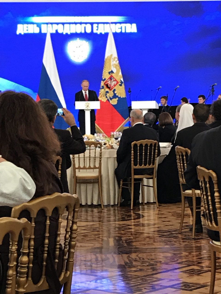 В ходе приема Владимир Путин поздравил присутствующих с праздником и вручил госнаграды за вклад в укрепление единства российской нации и за заслуги в укреплении мира и взаимопонимания между народами. В своем выступлении он отметил: «Каждый народ приносит миру свой урок, своё уникальное достояние. У России таким бесценным наследием является многовековой опыт мирного проживания людей разных национальностей. Другой такой большой, многоликой страны, как наша, просто нет. И сохранение разнообразия народов России, их этнической, культурной самобытности имеет для нас ключевое значение, также как традиции взаимного доверия, согласия и родства. Именно эти устои наполняют единство российской нации особой, внутренней силой».