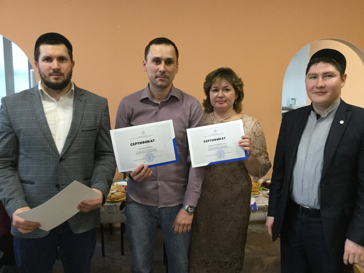 Сегодня вечером в 13 мечетях Казани и Татарстана торжественно вручили сертификаты слушателям курсов по изучению татарского языка "Без - татарлар". Таким образом завершились первые примечетские курсы по изучению татарского языка. Бесплатные трехмесячные курсы стартовали в феврале текущего года по инициативе муфтия Татарстана Камиля хазрата Самигуллина в 6 казанских мечетях – “Кабан арты”, “Гаилә”, “Тынычлык”, “Әниләр”, “Ярдәм» и «Марджани» и 7 мухтасибатах республики – Альметьевском, Зеленодольском, Набережночелнинском, Нижнекамском, Елабужском, Нурлатском, Чистопольском. Обучение в рамках курса прошло в двух направлениях: «Татарский язык» и «История татар и основы ислама».