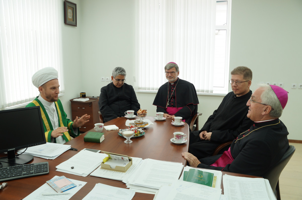 Сегодня ДУМ РТ посетила католическая делегация во главе с Апостольским Нунцием в Российской Федерации архиепископом Челестино Мильоре. Гостей принял первый заместитель муфтия Татарстана Рустам хазрат Валиулин. Во встрече также приняли участие епископ ординарной Римско-католической епархии святого Климента в Саратове Клеменс Пиккель, генеральный викарий епархии отец Диогенес Уркиза и настоятель прихода «Воздвижение Святого Креста» Римской Католической Церкви в Казани отец Андрей Старцов.
