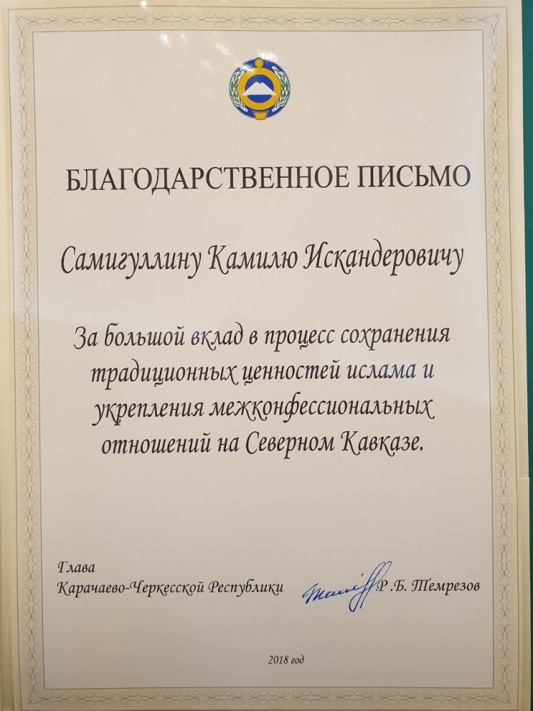 Муфтий Республики Татарстан Камиль хазрат Самигуллин и его заместитель, ректор Болгарской исламской академии и Российского исламского института Рафик хазрат Мухаметшин прибыли с рабочим визитом в Черкесск. Здесь проходит Международная конференция «Роль и место духовных ценностей исламской религии в современных условиях. Форум религиозных деятелей проходит под знаком 20-летия со дня образования Координационного центра мусульман Северного Кавказа - централизованной религиозной организации, объединяющей на добровольной основе действующие на территории Северного Кавказа муфтияты. Председателем КЦМСК является муфтий Карачаево-Черкесской Республики Исмаил хаджи Бердыев.