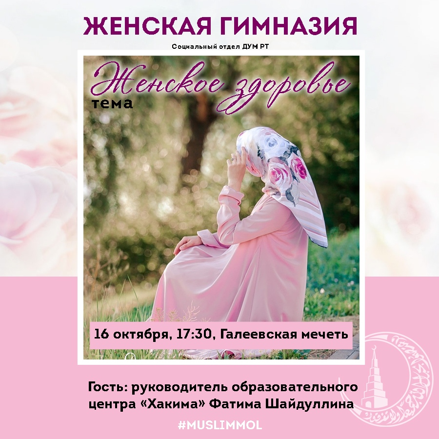 Самым большим даром Всевышнего после веры является здоровье. А здоровье женщины – это не только отсутствие болезней и физиологических недостатков, но и состояние полного душевного, физиологического и социального благополучия. В этот вечер участницы встретятся с руководителем образовательного центра «Хакима» Фатимой Шайдуллиной. Разговор пойдет о женском здоровье.