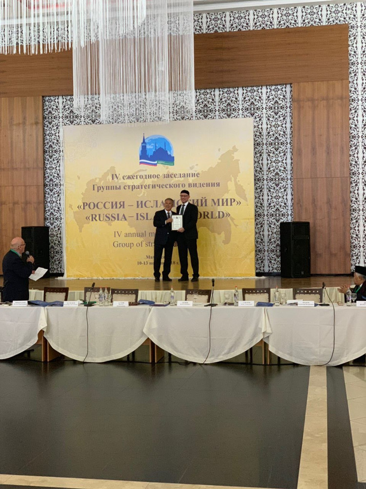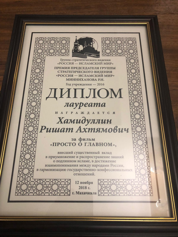 Сегодня в завершение IV Заседания Группы стратегического видения Президент Республики Татарстан и председатель Группы стратегического видения Рустам Минниханов вручил национальную премию «Россия – Исламский мир». Одним из обладателей премии 2018 года стал Издательский дом «Хузур» Духовного управления мусульман Республики Татарстан. Дипломом лауреата награжден советник муфтия РТ, директор ИД «Хузур»ДУМ РТ Ришат Хамидуллин за фильм "Просто о главном", включающий социальные ролики об антиэкстремистской направленности, направленные на профилактику межрелигиозной и межнациональной нетерпимости.