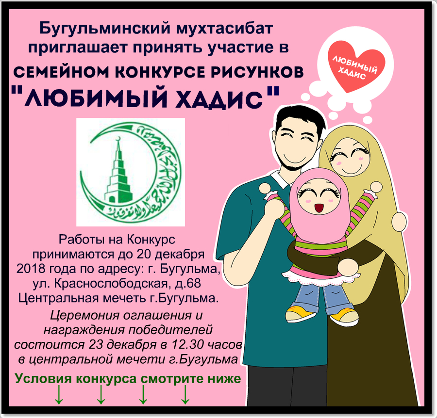 Мухтасибат г.Бугульма объявляет творческий семейный конкурс детских рисунков «ЛЮБИМЫЙ ХАДИС». К участию в конкурсе приглашаются все желающие.