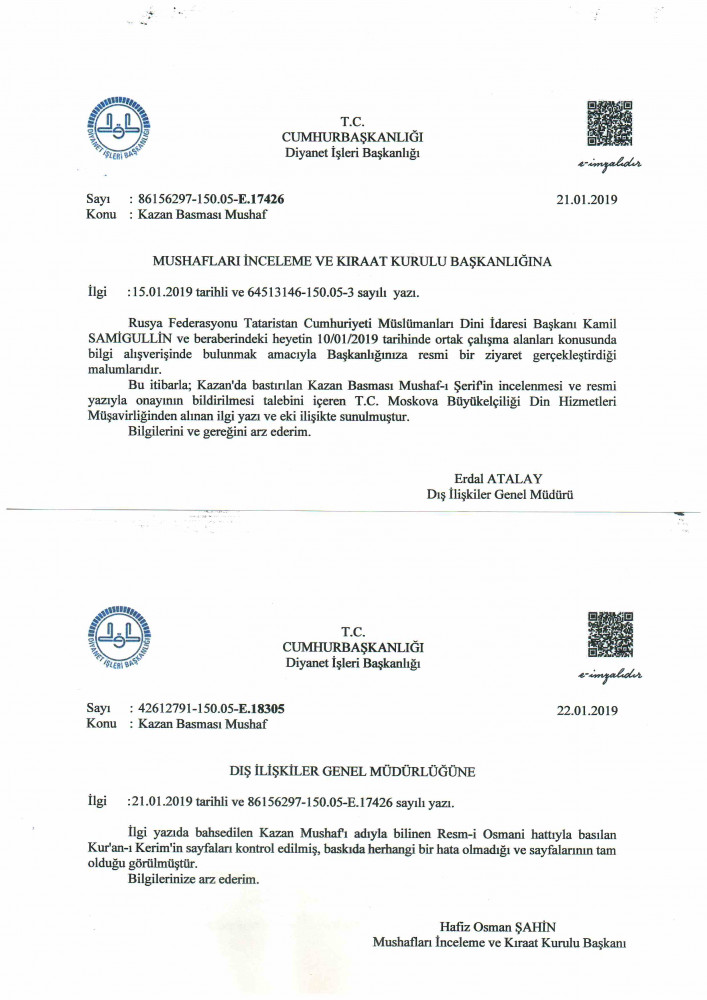 Это не первая положительная оценка издания Куръана, выпущенного ДУМ РТ. В 2017 году издание, выпущенное муфтиятом, успешно прошло проверку Высшей комиссии по делам Досточтимого Куръана при Министерстве вакфов Сирии. В результате Священная Книга, которую подготовили и выпустили в Казани, получила Свидетельство о соответствии международным стандартам. В Свидетельстве указывается, что издание ДУМ РТ соответствует древнему списку Расм Усмани (согласно принятым канонам по количеству букв и слов). Также оно признано удобным для чтения, заучивания текста и правильного произношения, что особенно важно для читателей, не владеющих арабским языком. Все примененные для этого знаки в тексте издания одобрены.