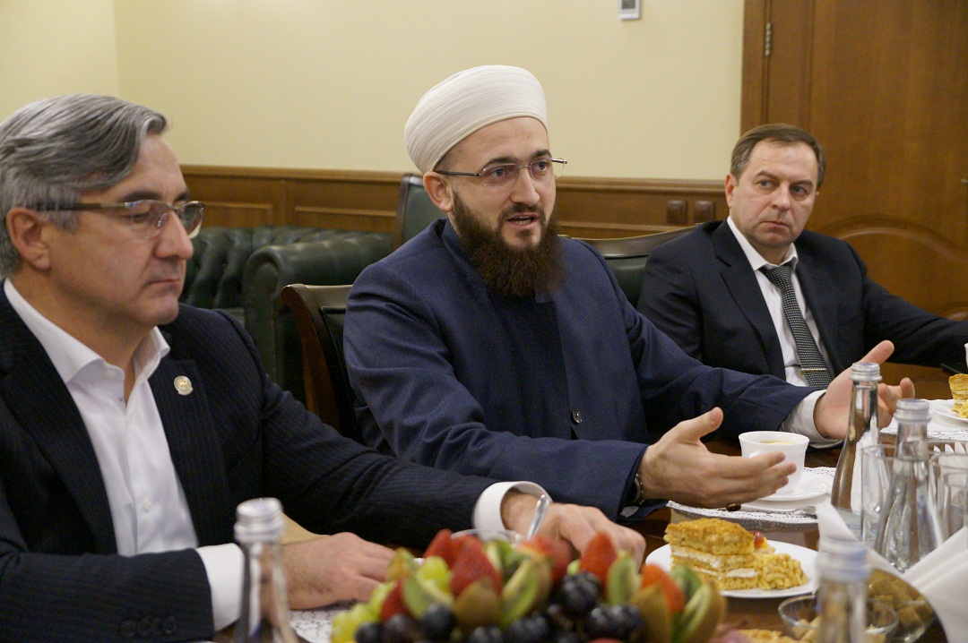 За круглым столом в формате беседы глава мусульман Татарстана поприветствовал гостей и познакомил их с современной ситуацией в области развития ислама, рассказав, что сегодня в республике действуют свыше 1500 мечетей, 48 мухтасибатов и одна из самых эффективных систем казыятов в России, состоящая из 9 казыятов. Далее он остановился на деятельности муфтията по пропаганде традиционных ценностей Ислама, как наиболее важной работе по профилактике религиозного экстремизма: целый ряд собственных медиапроектов Издательского дома «Хузур» ДУМ РТ – мусульманский телеканал «Хузур ТВ», радио «Азан», портал «Ислам тудей», а также печатные СМИ на русском и татарском языках и активная разъяснительная работа в социальных сетях - реализуются с целью формирования положительного общественного мнения об исламе, религиозной культуры и интереса к татарскому духовному наследию среди населения.