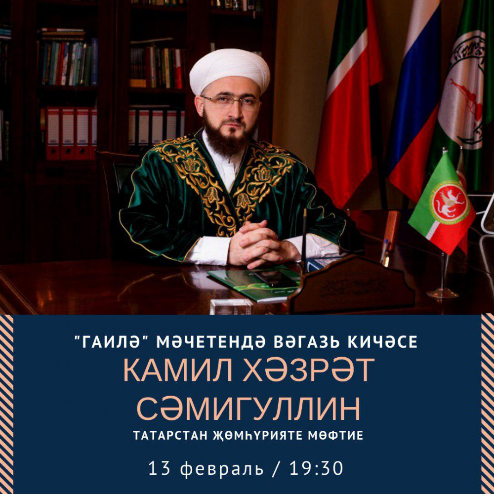 Сегодня, 8-го джумадаль-ахира (13 февраля), в 19:30 муфтий республики Татарстан Камиль хазрат Самигуллин проведет вагаз в казанской мечети «Гаиля».  Принять участие во встрече с муфтием приглашаются все желающие.  В своей проповеди глава мусульман Татарстана рассмотрит вопросы ценностей религии Ислам, а также проблемы семейных взаимоотношений. Кроме того, у участников появится возможность задать муфтию интересующие вопросы. Мечеть «Гаиля» расположена по адресу: ул. Д.Файзи, д.2. Вход свободный.