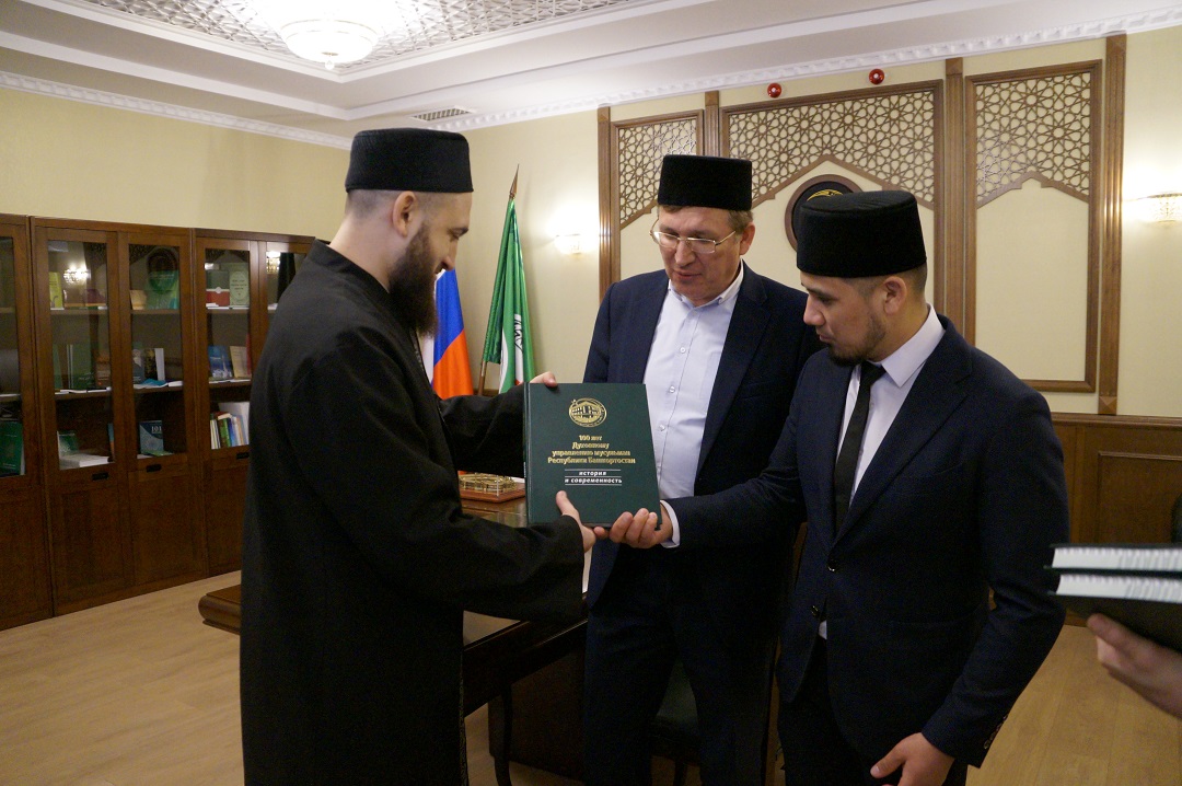 Встреча продолжилась в муфтияте Татарстана. Айнур хазрат Биргалин поблагодарил муфтия Камиля хазрата Самигуллина за теплый прием. В память о встрече он подарил альбом «100 лет Духовному управлению Башкортостана». Муфтий Татарстана отметил важность работы в тесном сотрудничестве и укреплении взаимоотношений между религиозными организациями двух республик. «Большую поддержку в этом направлении оказывает канал «Хузур ТВ». Первое мусульманское телевидение сегодня транслируется и в Башкортостане, в эфире транслируются духовные ценности, что также способствует укреплению братских отношений между народами», – сказал он. На память Камиль хазрат преподнес гостям в дар книги, изданные ИД «Хузур».