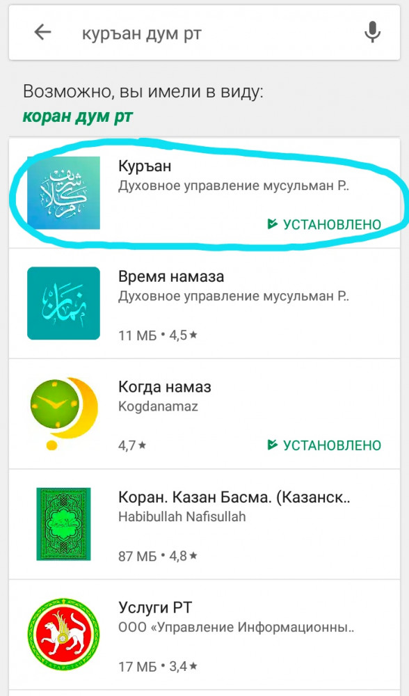 Скачать приложение «Куръан «Казан басма» можно в Google play, набрав в поисковике КУРЪАН ДУМ РТ или КУРЪАН КАЗАН БАСМА, либо скачать по следующей ссылке: