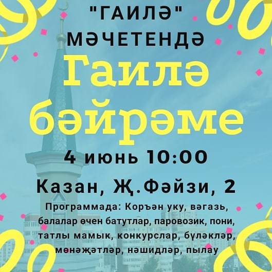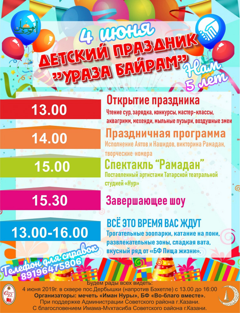 В этот же день для жителей азинской части Казани в 10:00 еще один семейный праздник готовит казанская мечеть «Гаиля» (ул. Д. Файзи, д.2), а в сквере казанского поселка Дербышки (напротив магазина «Бахетле») пройдет общегородское мероприятие для детей «Ураза-байрам». Мероприятие организуется мечетью «Иман нуры», благотворительным фондом «Во благо вместе», администрацией и мухтасибатом Советского района г.Казани. Праздник начнется в 13:00 с чтения Священного Куръана. В программу также включены чтение стихов, нашидов, творческие выступления, викторина, посвященная Рамадану, игры для детей, мастер-классы, аквагрим и другие развлекательные мероприятия. Будет работать два трогательных зоопарка, батут, детский городок "КидСпейс", зона "Сабантуй", фотозона. Кроме того, детская театральная студия "Нур" представит гостям праздника спектакль "Что такое Рамазан?".