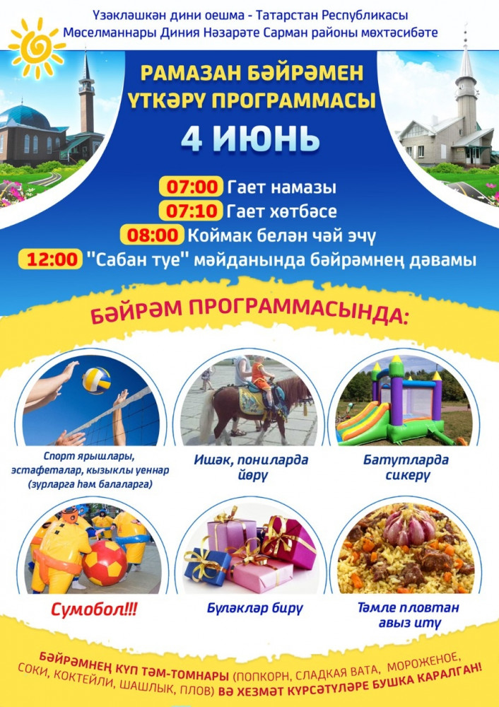 В Сармановском мухтасибате праздничные мероприятия по случаю Ураза-байрама пройдут в 14:00 на площади «Сабантуй». Здесь планируется провести велопробег. Гости смогут принять участие в подвижных играх, побороться за призы и попробовать вкусный плов. Для детей будет работать батут.