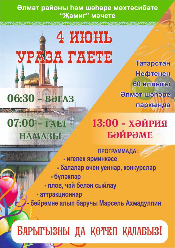 Альметьевский мухтасибат также планирует провести мероприятие с большим размахом. 4 июня в 13:00 в Городском парке имени 60-летия нефти Татарстана пройдет благотворительное мероприятие в честь Ураза-байрама. В общегородском празднике примут участие свыше 5000 человек. В программе: бесплатные аттракционы, плов, благотворительная ярмарка, игры и конкурсы для детей, призы и подарки. Ведущий праздника - Марсель Ахмадуллин.