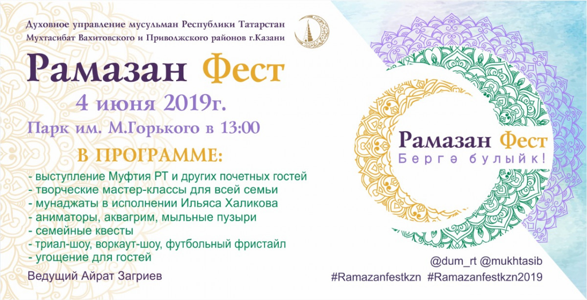 Так, в этом году казанцев порадуют небывалым семейным праздником в Ураза-байрама в Центральном парке культуры и отдыха имени М.Горького. Здесь 4 июня в 13.00 начнется «Рамазан Фест». Организатором общегородского мероприятия выступает Духовное управление мусульман РТ совместно с мухтасибатом Вахитовского и Приволжского районов г.Казани. Праздничную программу праздника посвятят теме семейных ценностей и укрепления преемственных связей между молодым и старшим поколением. Тему раскроют артисты, которые в роли бабушки, дедушки, мамы, папы, брата, сестры и внуков будут приглашать посетителей принять участие в мастер-классах. Так, в разных точках парка запланированы «мастерские» по вышиванию, вязанию, рисованию, изготовлению кожаных браслетов, глиняных изделий, по лепке из пластилина, чеканке монет, завязыванию платков. Ожидается лекция от дизайнера Нурии Умай о трендах в мусульманской моде, а также фотосессия с девушками в национальных нарядах. Кроме того, для участников праздника подготовили увлекательные квесты, а также фристайл-, триал- и воркаут-шоу. Юных посетителей ждут игры с аниматорами, аквагрим, различные аттракционы, шоу мыльных пузырей и научное химическое шоу. На празднике также прозвучат мунаджаты в исполнении Ильяса Халикова. Ведущим мероприятия на главной сцене станет Айрат Загриев. Гостей парка ждут также угощения и подарки. Программа завершится финальным запуском шаров в небо. Планируется, что в мероприятии примут участие около 10 тысяч человек. По словам организаторов, "Рамазан фест" будет интересен для всех посетителей парка независимо от национальности и вероисповедания.