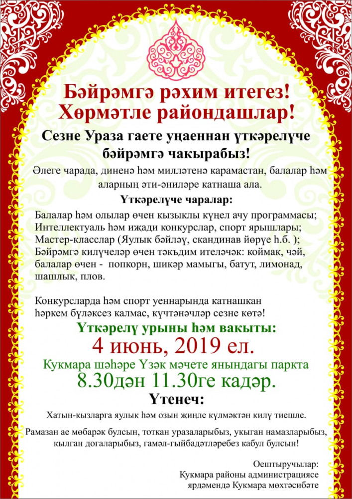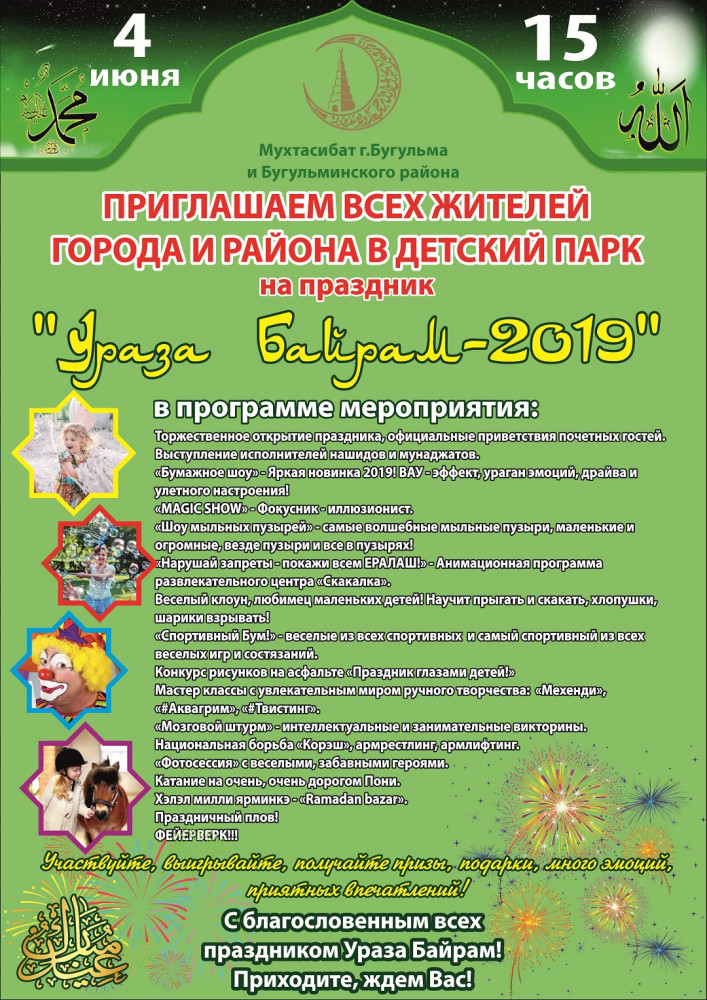 4 июня в Бугульминском Детском парке пройдет семейный праздник «Ураза-байрам-2019». В программе: чтение нашидов, мунаджатов, выступления почетных гостей. Кроме того, пройдут различные мастер-классы, интеллектуальная викторина, конкурс детского рисунка на асфальте, а также национальная борьба «Көрәш», армрестлинг, армлифтинг и другие спортивные мероприятия. Будет работать халяльно-национальная ярмарка «Рамазан базар». Ребят порадуют аквагрим, мыльными пузырями, бумажными представлениями. Посетителей парка ожидает горячий плов. Программа завершится праздничным фейерверком.