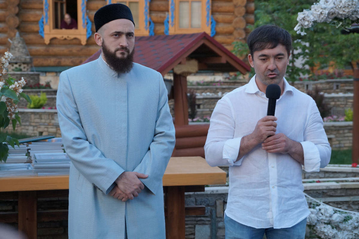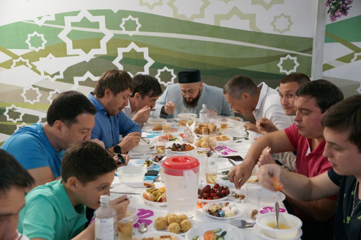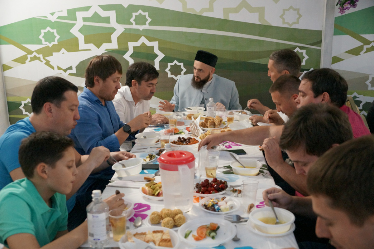Далее участники встречи совершили коллективный намаз под руководством муфтия и приступили к разговению.