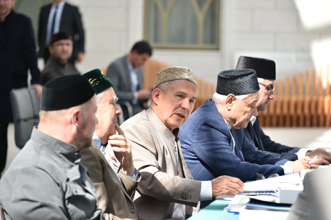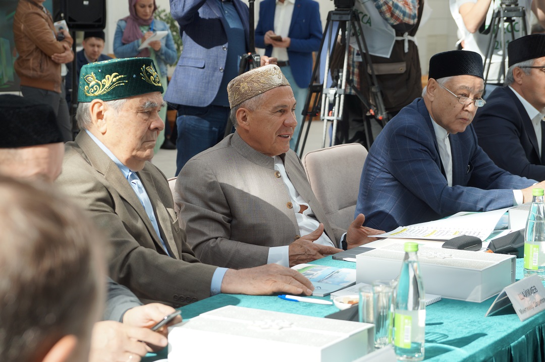 Приветствуя гостей, Рустам Нургалиевич в своей речи подчеркнул, что процессы, происходящие в исламском мире, в полной мере проявляются сегодня и в российской умме. Он отметил необходимость единения мусульман, выработки единых подходов противодействия негативным тенденциям. В этом процессе важную роль призвана сыграть Болгарская исламская академия. «Совсем недавно мы с вами принимали участие в церемонии закладки памятного камня в основание образовательного учреждения, а уже в этом году планируется защита первых докторских диссертаций по мусульманскому богословию. Мы надеемся, что выпускники академии будут содействовать укреплению традиционных духовных ценностей в обществе», - сказал Президент РТ и рассказал об успехах Татарстана по взаимодействию с исламскими организациями и странами мусульманского мира. «Вместе с тем, сегодня в мусульманском мире немало регионов и стран с нестабильной обстановкой, провоцируемой деятельностью экстремистских организаций, которые прикрываются исламом. В этой связи очевидна необходимость единения мусульман, а также дальнейшее развитие системы мусульманского образования», - снова подметил Президент РТ и передал слово муфтию Татарстана Камилю хазрату Самигуллину.