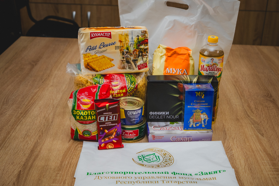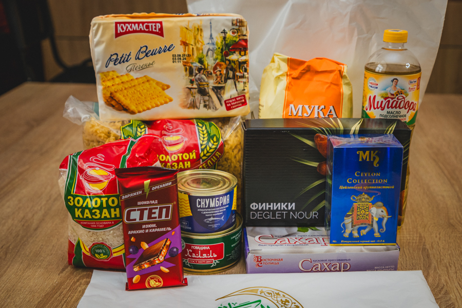 В составе продуктовых наборов, закупленных за счёт целевых денежных средств фонда: масло подсолнечное, крупа рисовая, мука, сахарный песок, шоколад, рыбная консерва, печенье, макароны, чай, финики и тушенка.